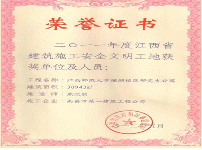 我司江西師范大學(xué)瑤湖校區(qū)研究生公寓項目工程獲得本年度“江西省建筑施工安全文明工地”稱號,該工程經(jīng)省級建筑安監(jiān)部門嚴(yán)格考核,通過層層篩選,在為數(shù)不多的省級樣板工地中脫穎而出,工程現(xiàn)場的安全文明設(shè)施布置規(guī)范、整潔,獲得專家評審組的一致好評。