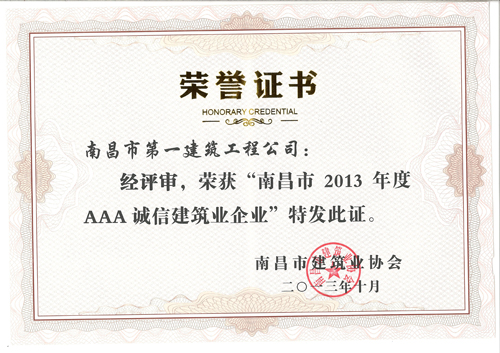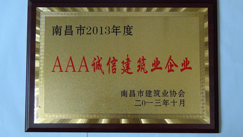 2013年10月我司獲得“南昌市2013年度AAA誠信建筑業(yè)企業(yè)”的榮譽(yù)稱號。