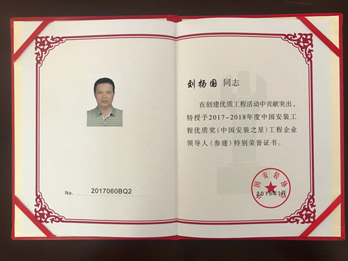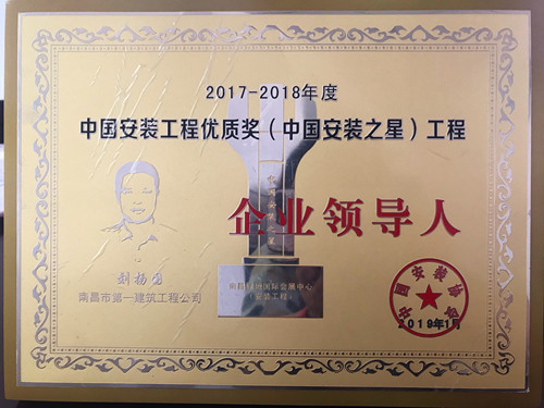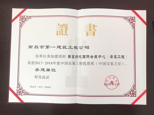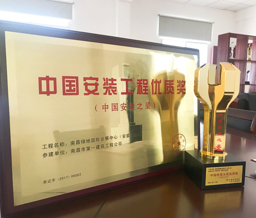 南昌市一建暖通分公司承建的江西綠地國際會展中心項目中央空調(diào)小園弧工程,被中國安裝協(xié)會評為第一批2017——2018度中國安裝工程優(yōu)質(zhì)獎,榮獲“中國安裝工程優(yōu)質(zhì)獎(中國安裝之星)”殊榮,董事長劉揚國同志被授予企業(yè)領(lǐng)導(dǎo)人(參建)特別榮譽證書。